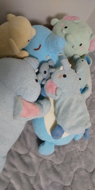 我が家のぬいぐるみ仲間とも感動の再会を果たし、今は土産話に花を咲かせています。他の子達もエステに興味津々です!