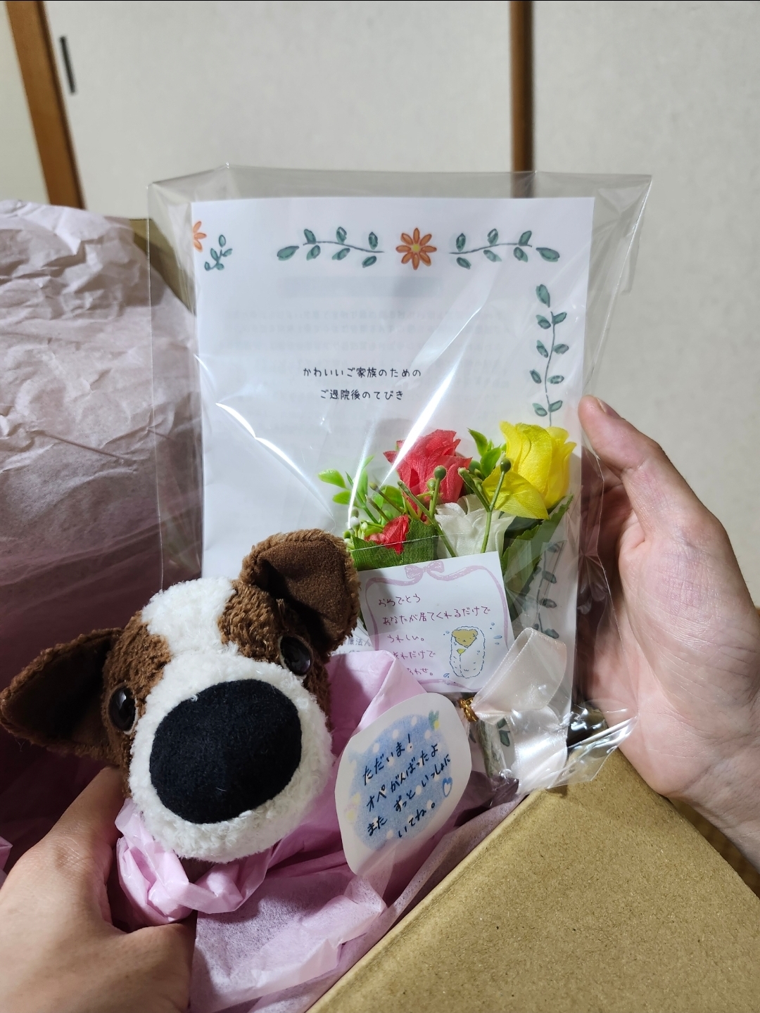 退院のときに添えてくださったお花やリボン、お手紙にも感動しました。ふっくらと元気な姿で帰ってきてくれたうちの子を見て、とても安心し、嬉しく思っています。