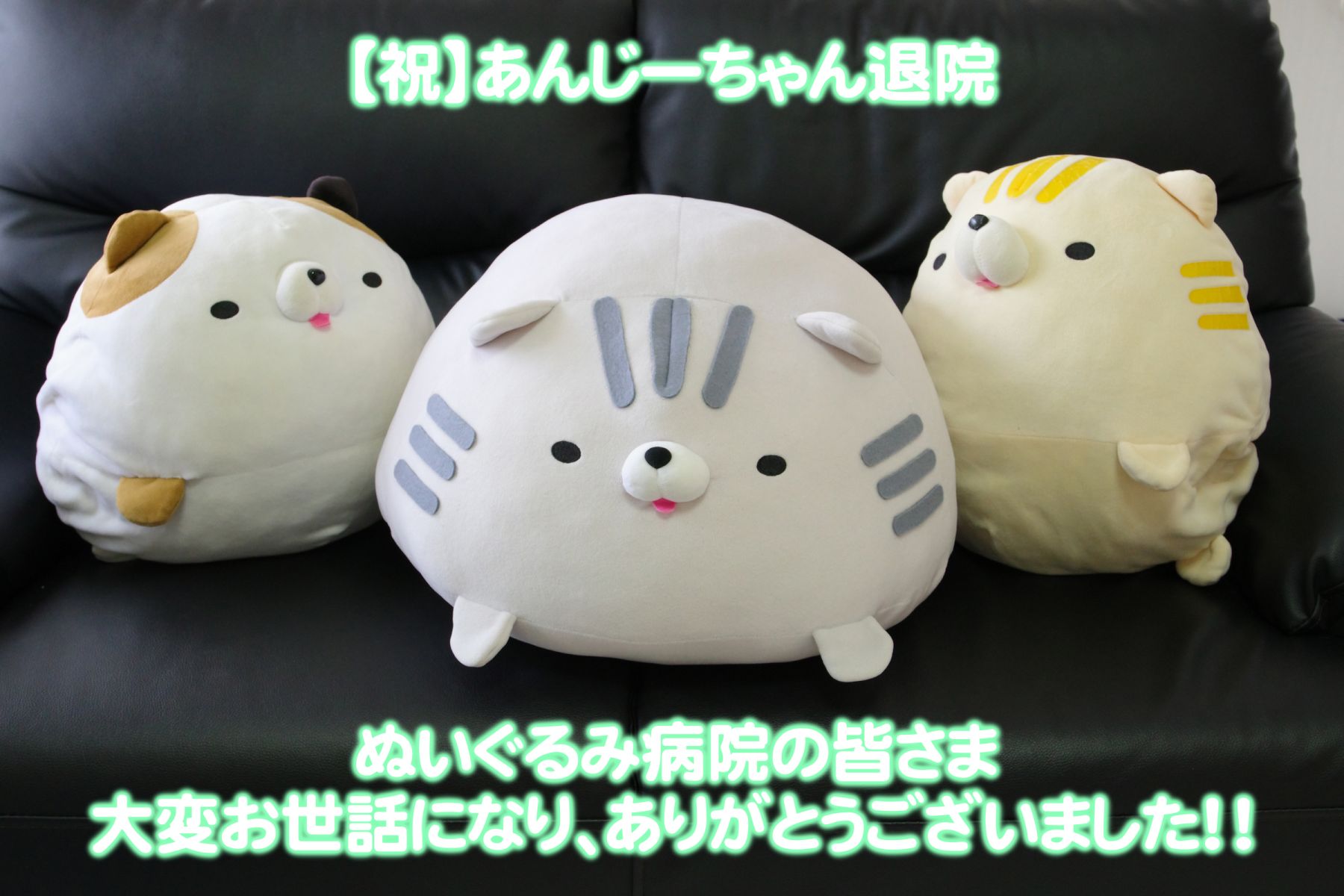 2人の見違えるような姿にびっくりしました!2人とも出会った頃のようにとても綺麗になり、綿入れ具合も満足しています。帰ってきてから我が家にいる友達に入院中の出来事を話したり綺麗になった姿を自慢げに披露してますので本人達も気に入っているようです。