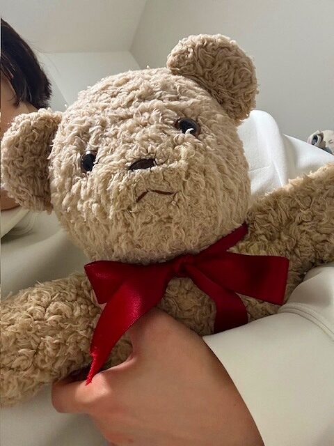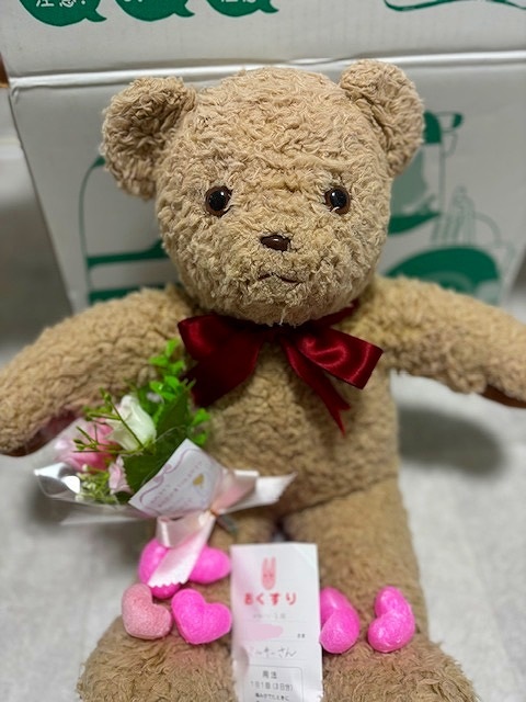 以前私が自己流で入れてあげたお風呂で脱色してしまい、綿も入れ替えてあげたかったけれど、ショックのあまり勇気が出ずに愛されこげ茶色のまま過ごしてきました。しかしSNSで病院を知ってから、いつかミルキーもお風呂に入れてあげたいなぁと思っていました。今回30歳を迎える節目にあと押しされて、病院へ送り出すことができました。
