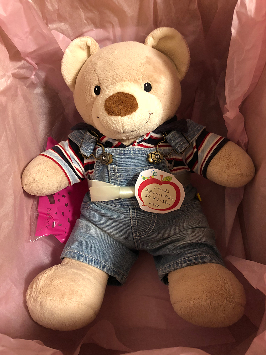 ドキドキしながらそ〜っとバスの天井を開封しますと、ピンクの紙に包まれた見覚えのあるシルエットが目に入り、中からおたねちゃんが勢いよく飛び出しました。