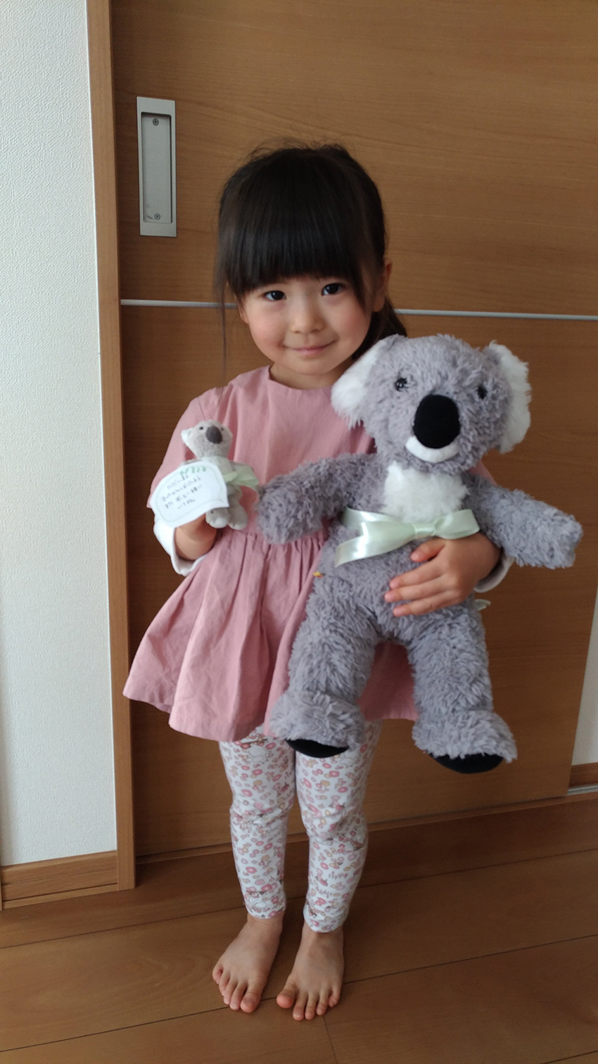 子供達はお薬に感激していました。診察券は大事にしまいました。直筆のお手紙にも感激しました。入院中、温かくお世話していただいたのが伝わってきました。本当にありがとうございました。家で待っていた仲間と退院記念写真撮影をしました。おくるみを気に入った仲間が早速借りて着ていました〜。
