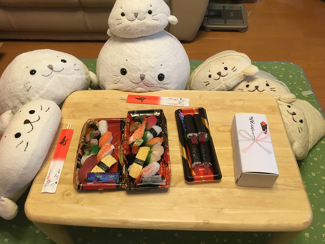 昨夜はえもんちゃんとすけちゃんの大好きなお寿司とケーキで家族そろって退院祝いのパーティーを開きました。