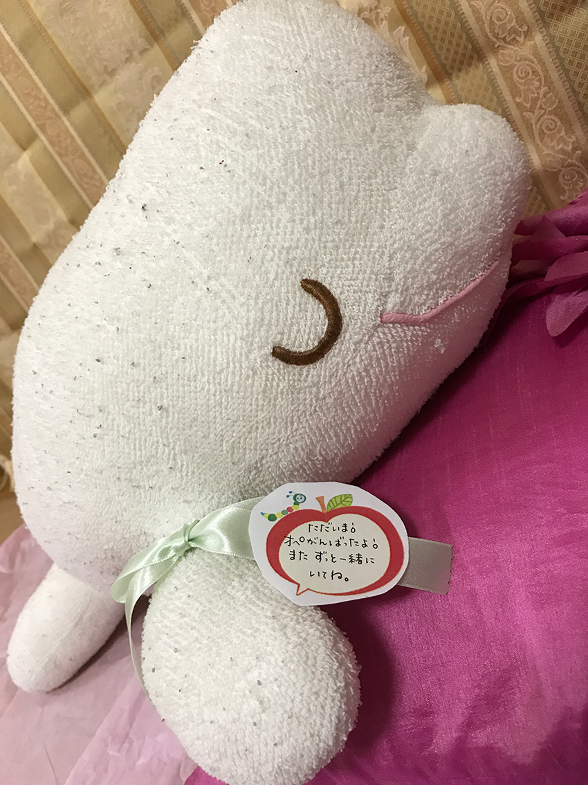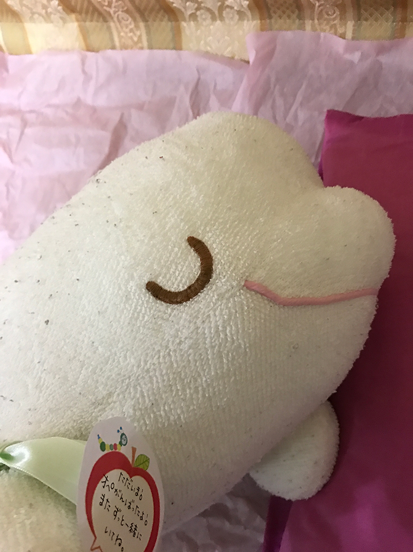 物心ついた頃からずっと一緒だったワンタンでしたが、気がついたら皮膚が薄くなり、ところどころほつれたり穴が空いていたりしていました。これ以上ほつれたりしないか心配で、一緒に遊びに出掛けられなくなっていました。一緒に遊べるようになるなら、少しくらい見た目が変わっても良いかな……と決心し、思い切って入院をさせることにしました。