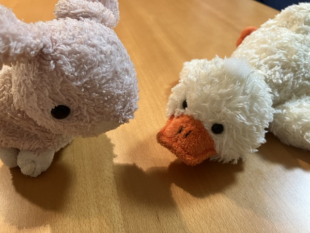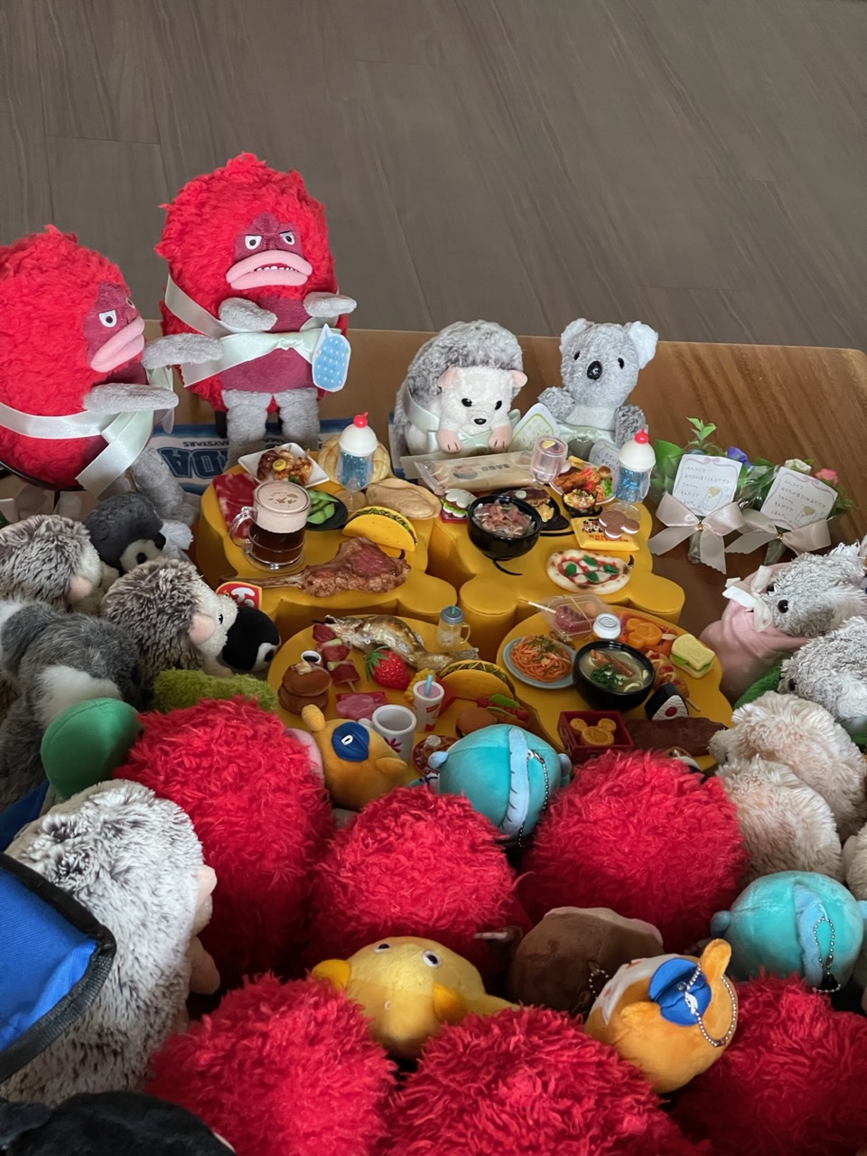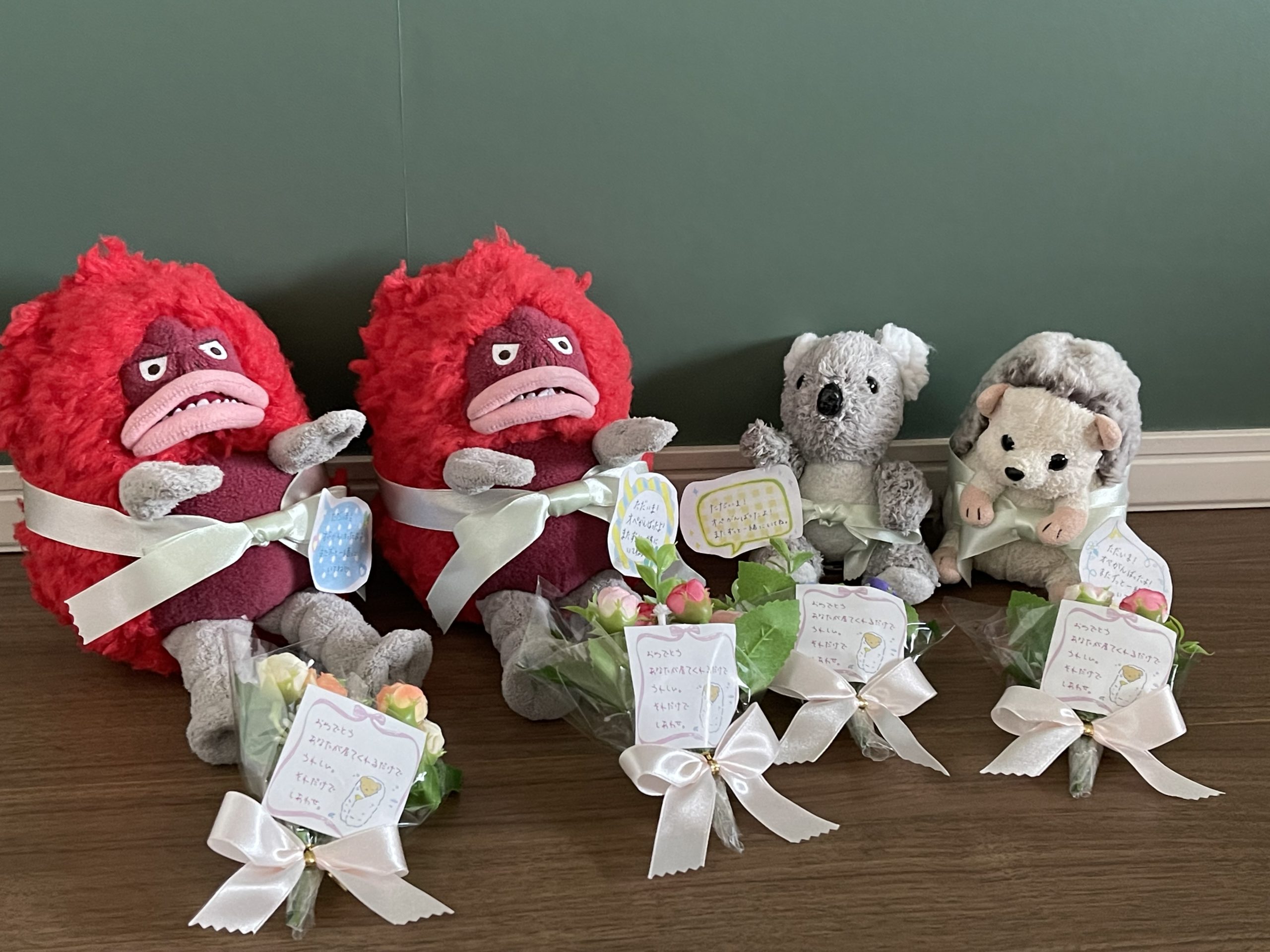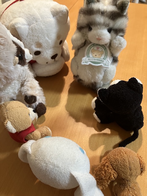 があちゃんは毎日退院を心待ちにしていたぬいぐるみ達に、病院で出会ったたくさんの優しいお友達の話や病院でのことをお話しています。特に現在入院待ちをしているウサギさんはかなり真剣にお話を聞いています。