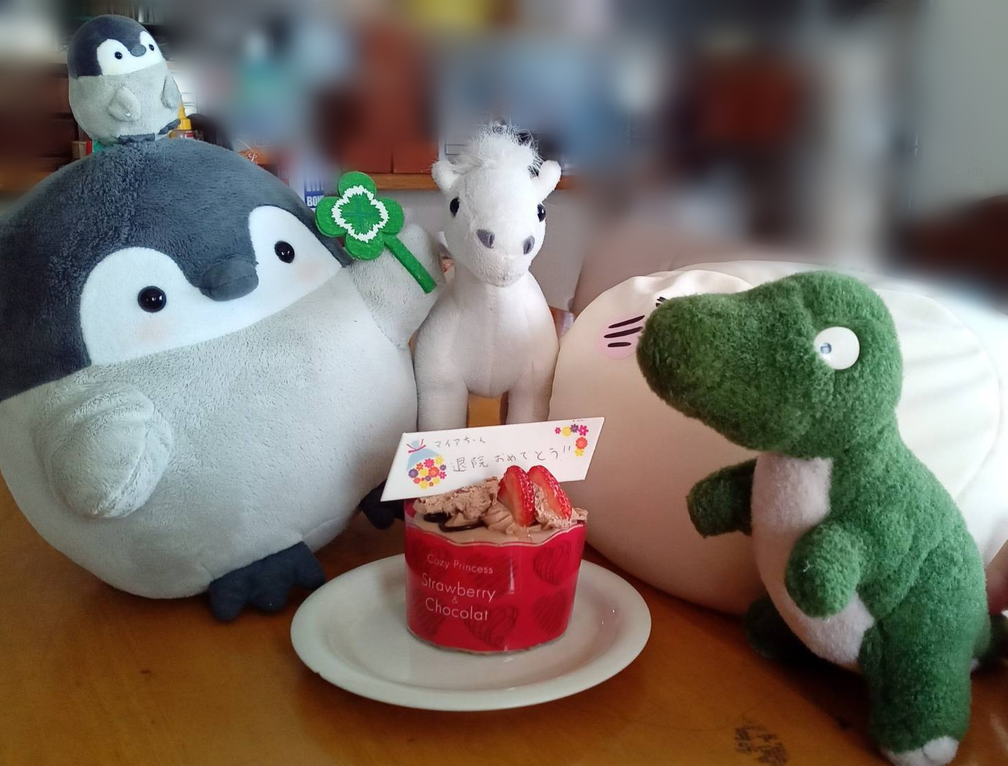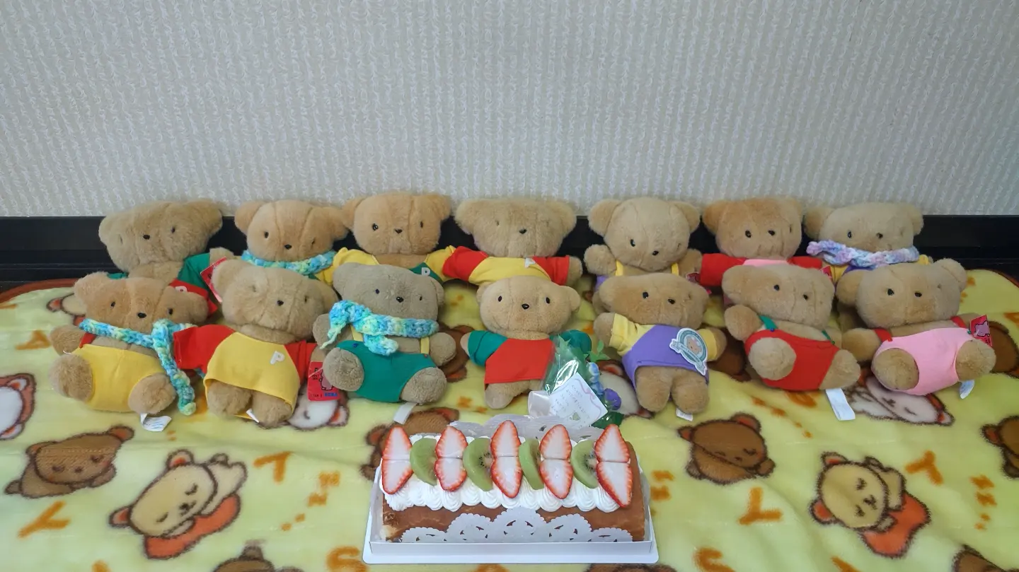 無事に我が家に帰って来てくれた時は笑顔でいっぱいになると同時にぬいぐるみ病院さまの素晴らしい技術に改めてびっくりさせられました!ケーキを買ってきて退院のお祝いをしたら2人ともおめめキラキラで喜んでくれました♪