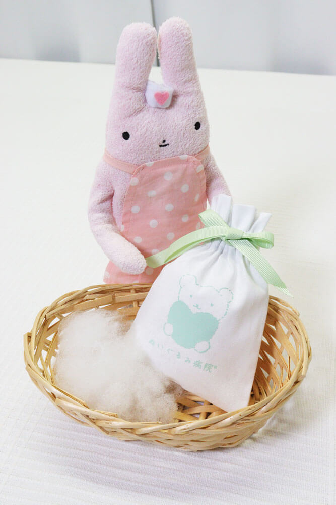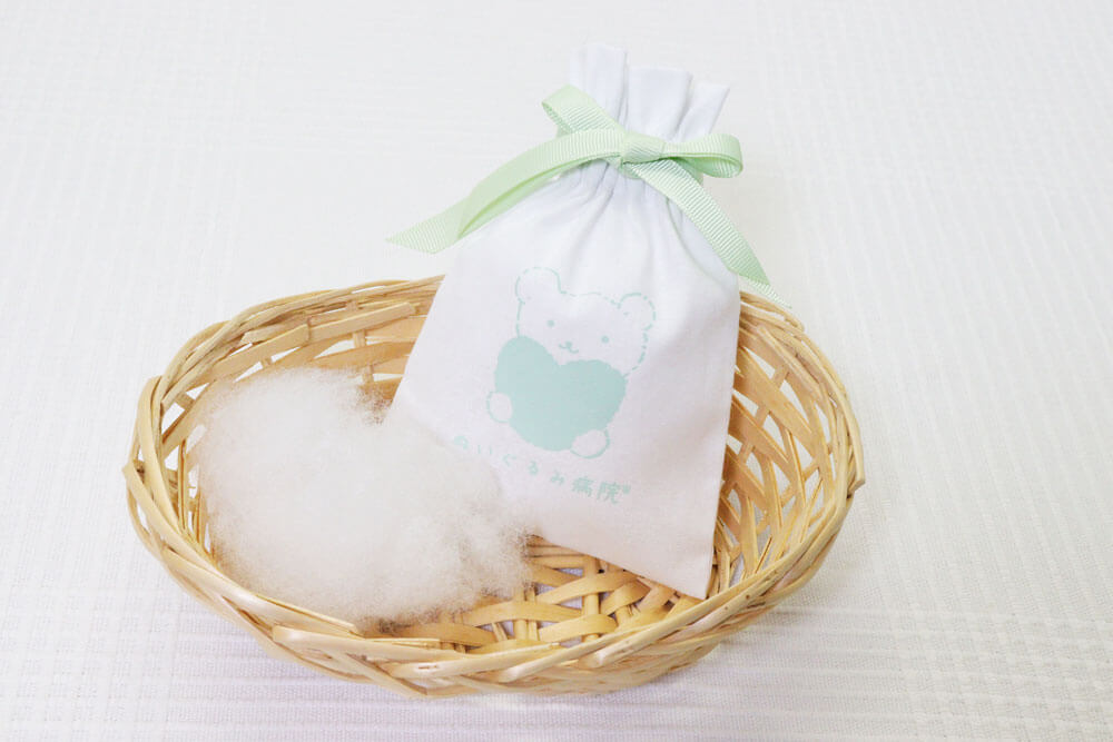 ぬいぐるみ病院オリジナル「愛されお綿袋」思い出のお身体に入っていた愛されお綿を、可愛いぬいぐるみ病院オリジナルの「愛されお綿袋」に大切にお包みしてお持ち帰りいただけます。