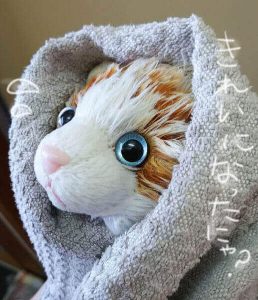 タオルとひなたぼっこで乾いて、ブラッシングしてもらったんですが、手触りがすごくいいと言ってましたにゃ!