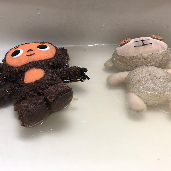 いつのまにかガサガサに汚れてしまい、このモフリーならばと思って勇気を出しお友達のチェブちゃんと一緒にお風呂チャレンジしました。