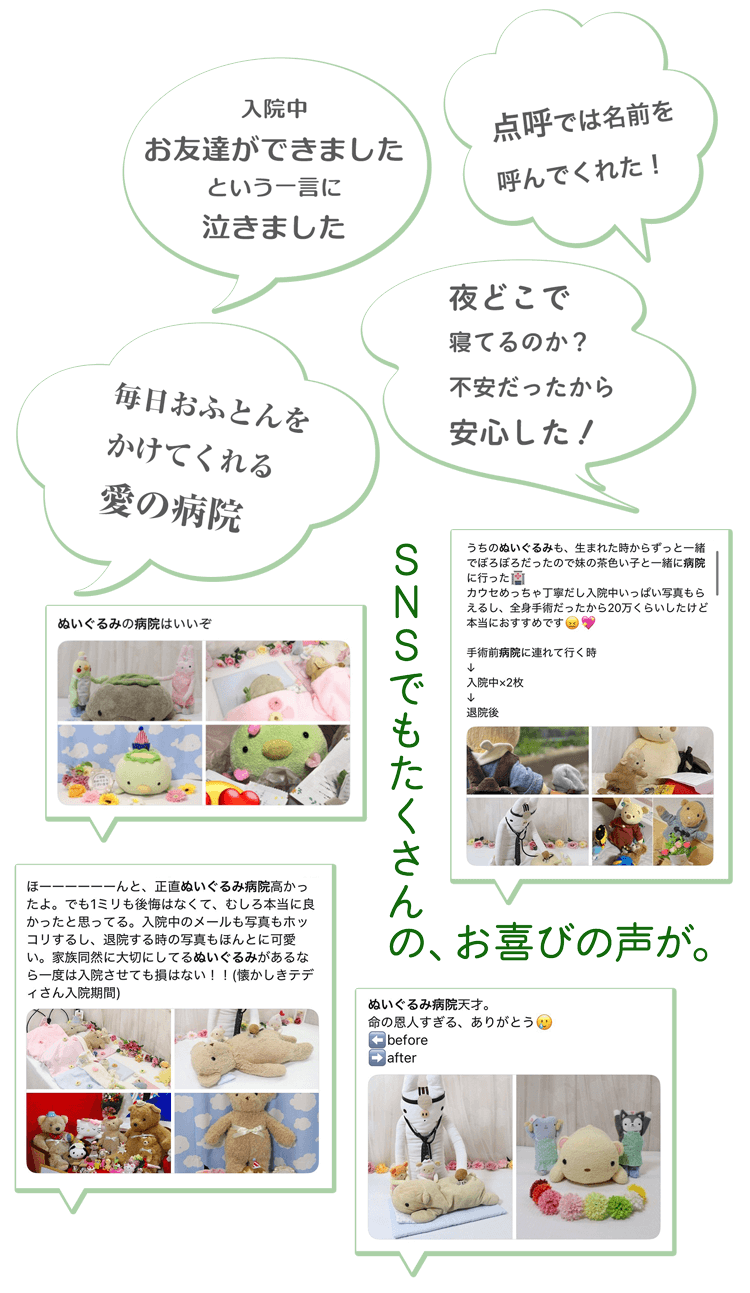 治療の出来はもちろんのこと、入院しているぬいぐるみたちのメンタル面、待っている家族のメンタル面もとても丁寧にケアしてくださり、感謝しています。